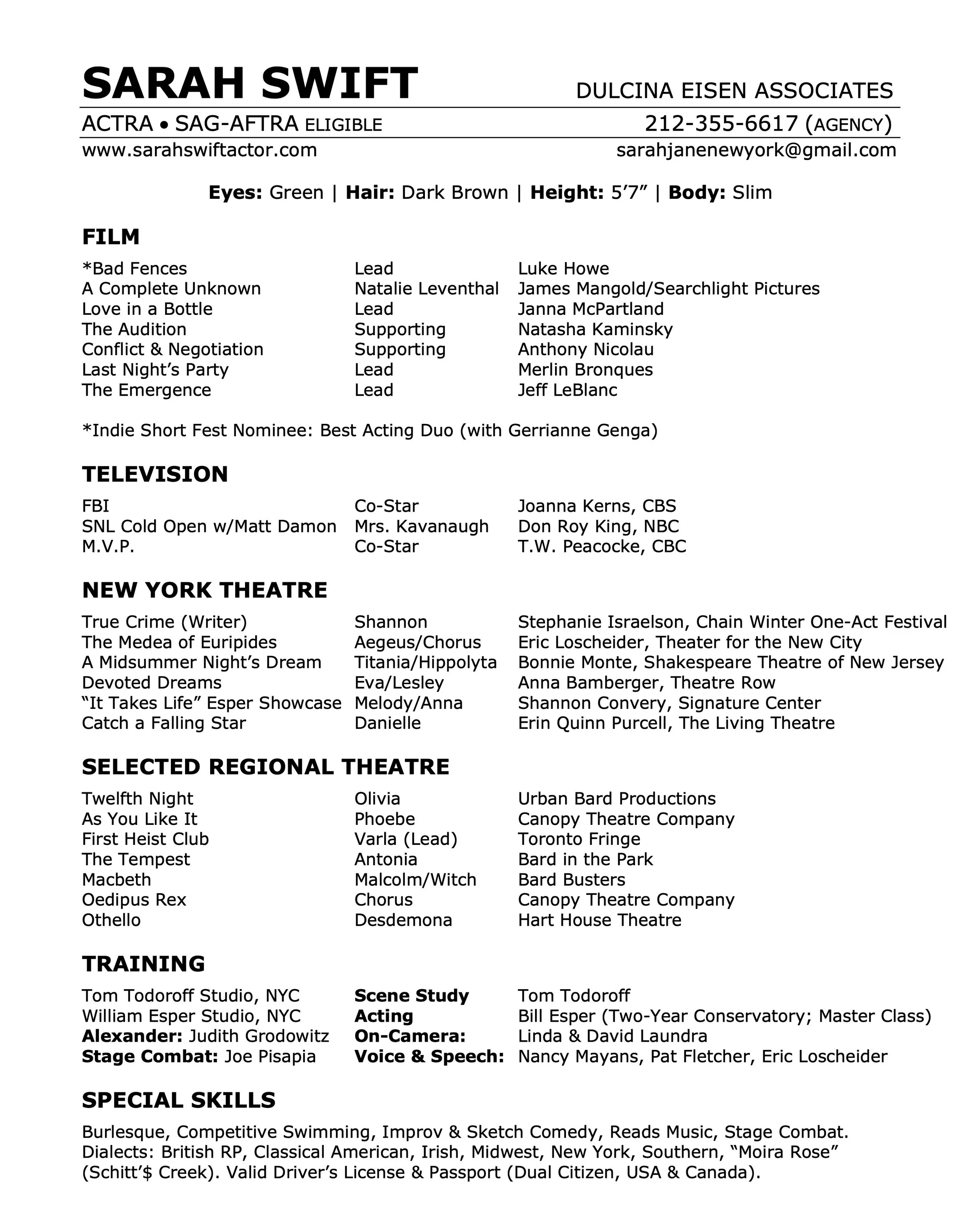 Sarah Swift is a Meisner-trained actor and writer, originally from Toronto, Ontario. She is a proud graduate of the William Esper Studio where she studied under the incomparable Bill Esper, who once told her she “lights up a room.”