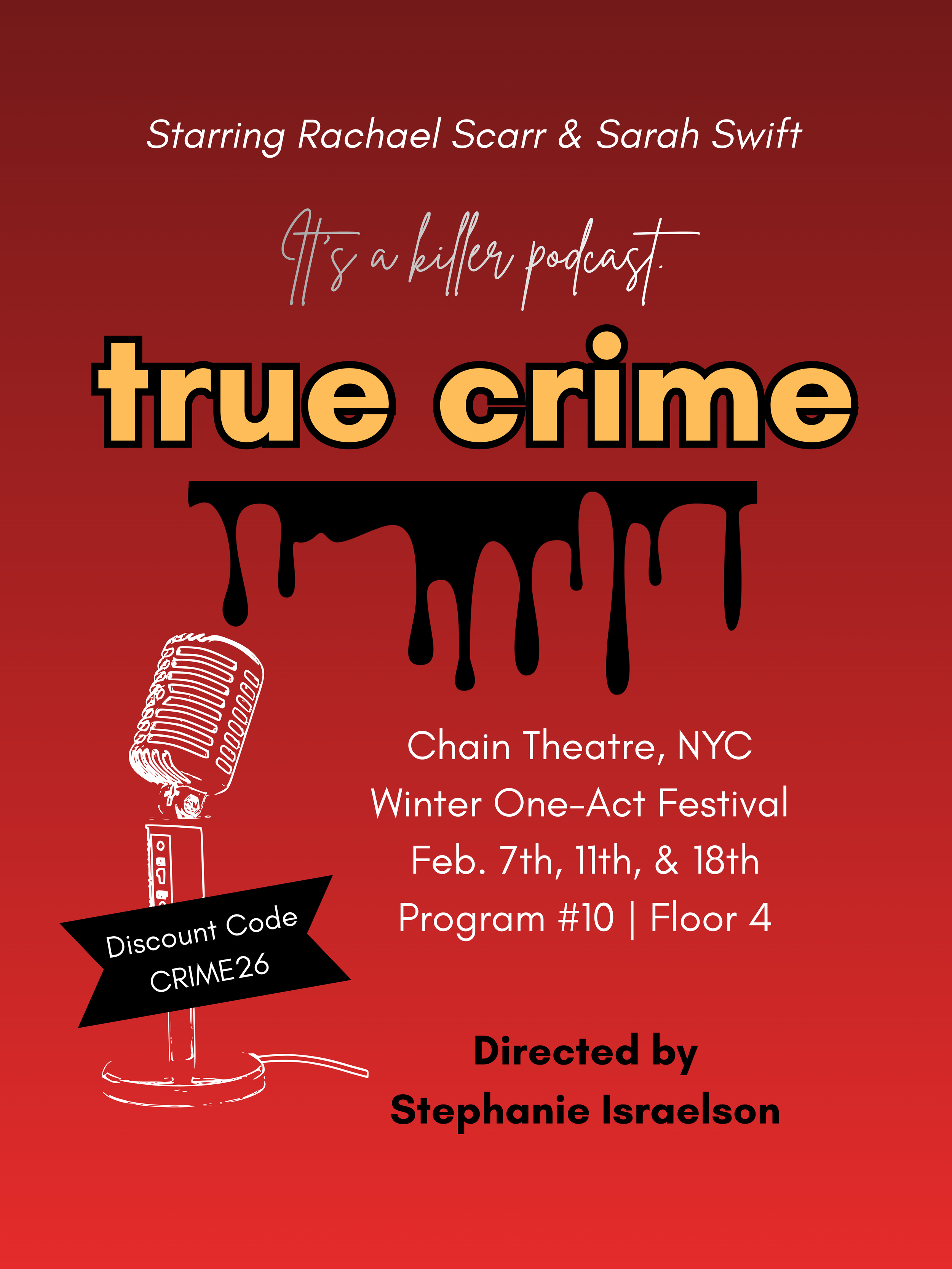 TRUE CRIME is a dark comedy told through the lens of two nerdy hosts of a murder podcast who concoct a deadly plan to save their show. Exploring themes of friendship and betrayal, the play examines society’s obsession with murder as entertainment and our desensitization to violence as a result.